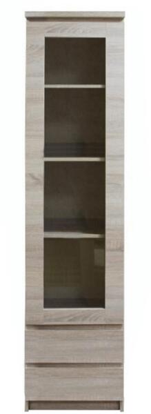 Vitrín egyajtós, két fiókos, TYP 04. Anyag: laminált DTD, ABS élek. Szín: tölgyfa sonoma. Méretek SzéxMéxMa: 50x41x200 cm. Összeszerelve szállítjuk - Mindigbútor