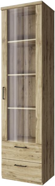 "Vitrin DORSI 1W2S Anyag: laminált DTD/MDF/üveg Szín: navarra tölgy Méretek (SzxMéxMa): 55,2x41x210,4 cm Anyag vastagsága: 1,6 cm Egyajtós Ajtók üveggel Polcos Két fiók Fiókok mérete (SzxMa): 54,6x21,6 cm Műanyag fogantyúk Fogantyúk színe: fekete Fiókok és polcok teherbírása: 5 kg Modern dizájn - Mindigbútor