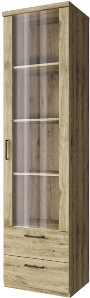 "Vitrin DORSI 1W2S Anyag: laminált DTD/MDF/üveg Szín: navarra tölgy Méretek (SzxMéxMa): 55,2x41x210,4 cm Anyag vastagsága: 1,6 cm Egyajtós Ajtók üveggel Polcos Két fiók Fiókok mérete (SzxMa): 54,6x21,6 cm Műanyag fogantyúk Fogantyúk színe: fekete Fiókok és polcok teherbírása: 5 kg Modern dizájn