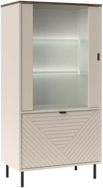 EYCO 1D1W Kasmír/Castello Tölgy Alacsony Vitrin - Modern Elegancia Otthonodba ✨ Ez az alacsony vitrin tökéletes választás, ha stílusos és praktikus tárolási megoldást keresel nappalijába vagy étkezőjébe. A kasmír és castello tölgy színkombinációja modern és elegáns megjelenést kölcsönöz neki. Főbb jellemzők:Modern dizájn: Letisztult vonalak és stílusos színkombináció. Praktikus tárolás: Két ajtó, két szekrény és polcok a tárgyak rendezett tárolásához. Üveges rész: Az üveges polcokon kiállíthatod kedvenc dekorációidat. Masszív anyagok: Laminált DTD, fóliázott MDF és ABS élek a tartósságért. Fém lábak: A fekete fém lábak stabilitást és eleganciát biztosítanak. Termékleírás:Anyag: Laminált DTD/fóliázott MDF/ABS élek/üveg Szín: Kasmír/castello tölgy Méretek (SzxMéxMa): 63,4x40x135,2 cm Anyag vastagsága: 1,6 cm Ajtók száma: Kétajtós Szekrények száma: Két szekrény Alsó szekrény méretei (SzxMa): 59,6x39,6 cm Polcok: Polcos Üveges töltet méretei (SzxMa): 47,6x77,3 cm Ajtók: Univerzális ajtók Fogantyúk anyaga: Fém Fogantyúk színe: Fekete Lábak anyaga: Fém Lábak színe: Fekete Lábak magassága: 12 cm Polc teherbírása: 5 kg Üveges polcok teherbírása: 3 kg További információk: Dekoratív ajtók Ajánlott a falhoz rögzíteni a biztonság érdekében. A LED világítás külön megvásárolható, hogy még hangulatosabbá tegye a vitrint. ? Szétszerelve szállítva.