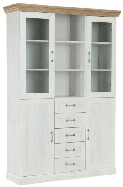 ROYAL W2D Vitrines Szekrény - Elegáns tárolás provence-i stílusban ? A ROYAL W2D vitrines szekrény tökéletes választás, ha egyedi, provence-i stílusú bútort keresel nappalidba vagy hálószobádba. Ez a szekrény nem csupán tárolóhely, hanem otthonod dísze is! Főbb jellemzők:Stílus: Elegáns, provence-i Szín: Északi sosna / vadtölgy kombináció Anyag: Laminált DTD váz + díszlécek, fém fogantyúk Tárolási lehetőségek: Négy szekrény Öt fiók Nyitott polcos rakodótér Méretek: Szélesség: 127 cm Mélység: 39 cm Magasság: 187 cm Váz vastagsága: 15 mm Felsőlap vastagsága: 22 mm További információk: A termék lapraszerelten kerül szállításra. A fém fogantyúk tovább erősítik a bútor elegáns megjelenését. ✨ A nyitott polcok ideálisak dekorációs tárgyak, könyvek vagy növények elhelyezésére. ?? A zárt szekrények és fiókok praktikus tárolást biztosítanak a kevésbé dekoratív holmik számára. ?